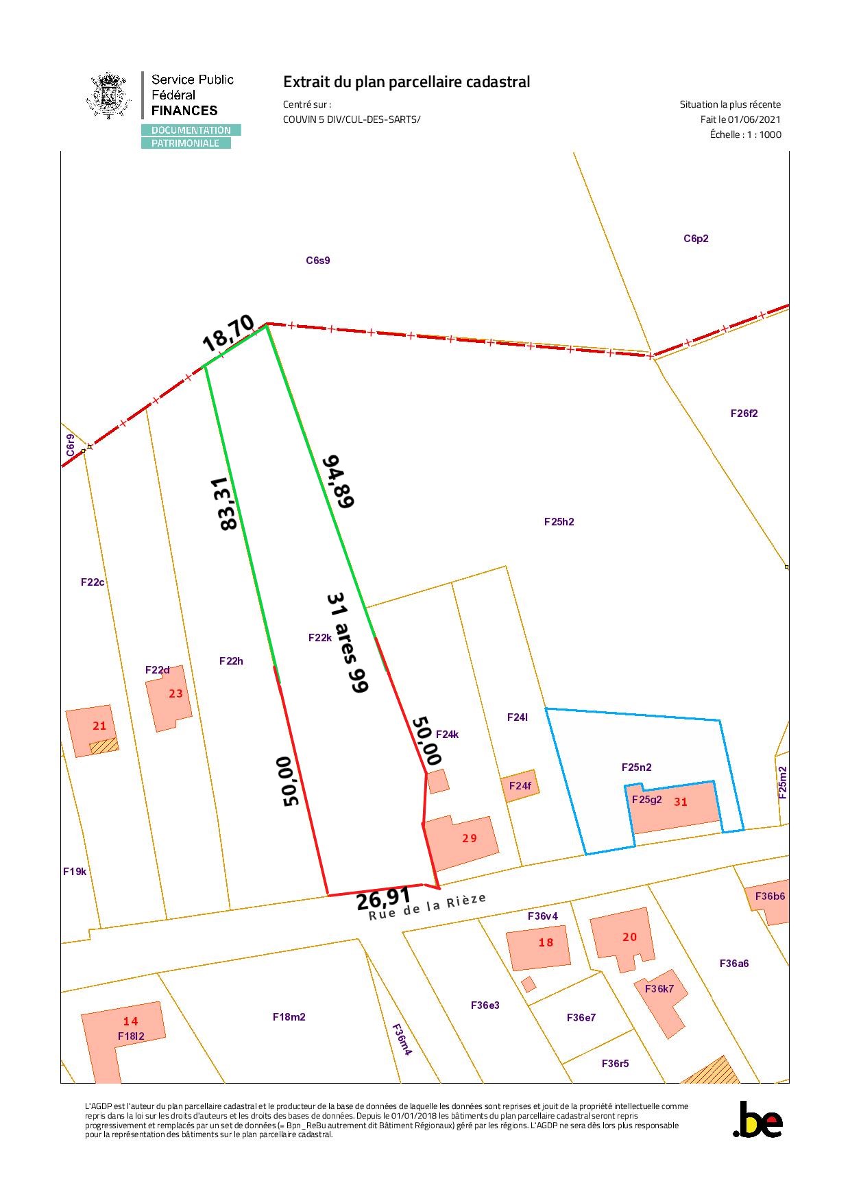 Couvin (Cul des Sarts): terrain à bâtir de 31 ares 99 ca. Façade de +- 26,91m. Profondeur en trapèze (un côté de +- 83m et de l'autre +- 94m). Terrain plat. Endroit calme et campagnard. Faire offre à partir de 59.000€. www.avenir-immobilier.be 071/22.11.41 (l'agent n'a aucun pouvoir de décision quant aux offres reçues). GPS 49.96382990821357, 4.459091370929932